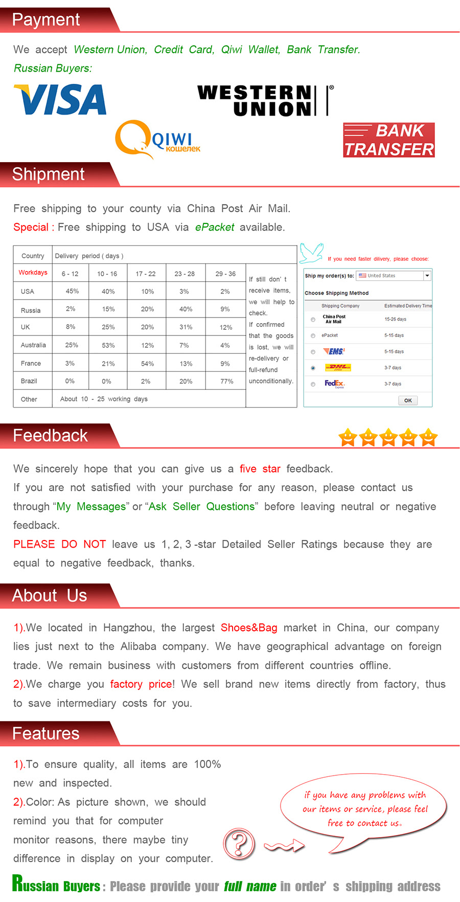If the product you receive is not as described or low quality, the seller promises that you may return it before order completion (when you click "Confirm Order Received" or exceed confirmation timeframe) and receive a full refund. The return shipping fee will be paid by you. Or, you can choose to keep the product and agree the refund amount directly with the seller.N.B.: If the seller provides the "Longer Protection" service on this product, you may ask for refund up to 15 days after order completion.