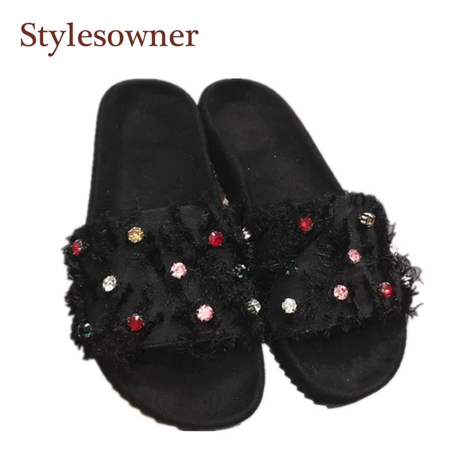 Stylesowner 2018 New Summer Lady Slides Silk Fringe Open Toe Flat Slip On Comfortable Outdoor Shoe Diamond Beautiful Slipper
