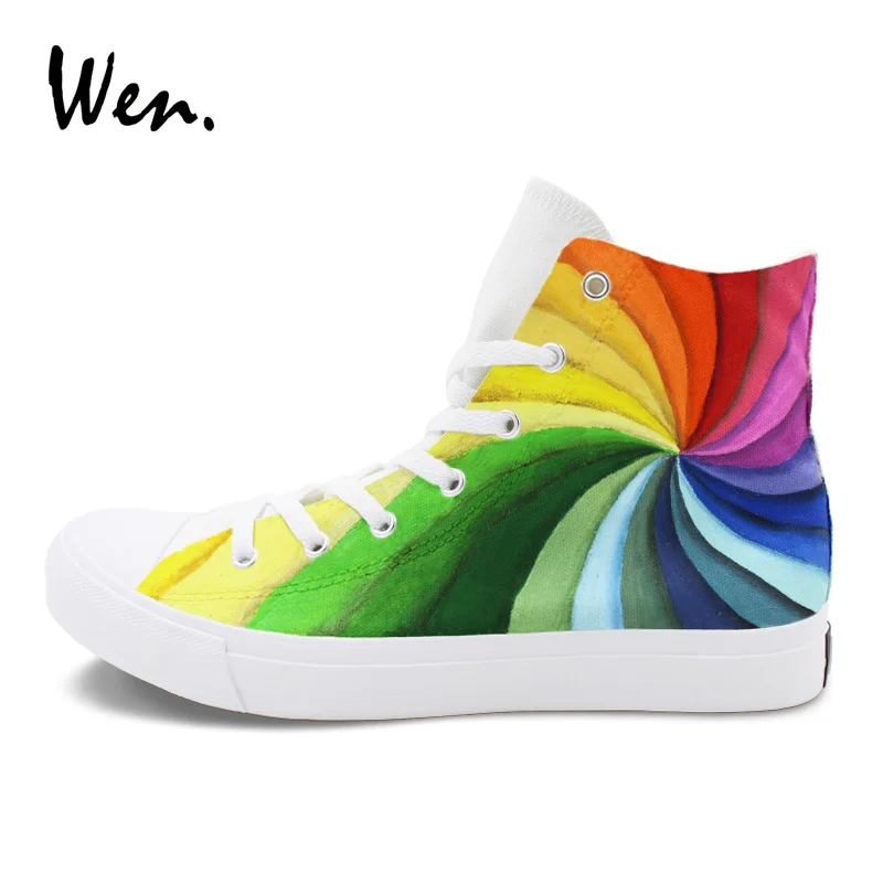 On-time Delivery: If you do not receive your purchase within 60 days, you can ask for a full refund before order completion (when you click "Confirm Order Received" or exceed confirmation timeframe).Hurry! Flash Deal Wen Hand Painted Canvas Shoes High Top Original Design Rainbow Color Vortex Colorful Painting Men Women Skateboarding Shoes