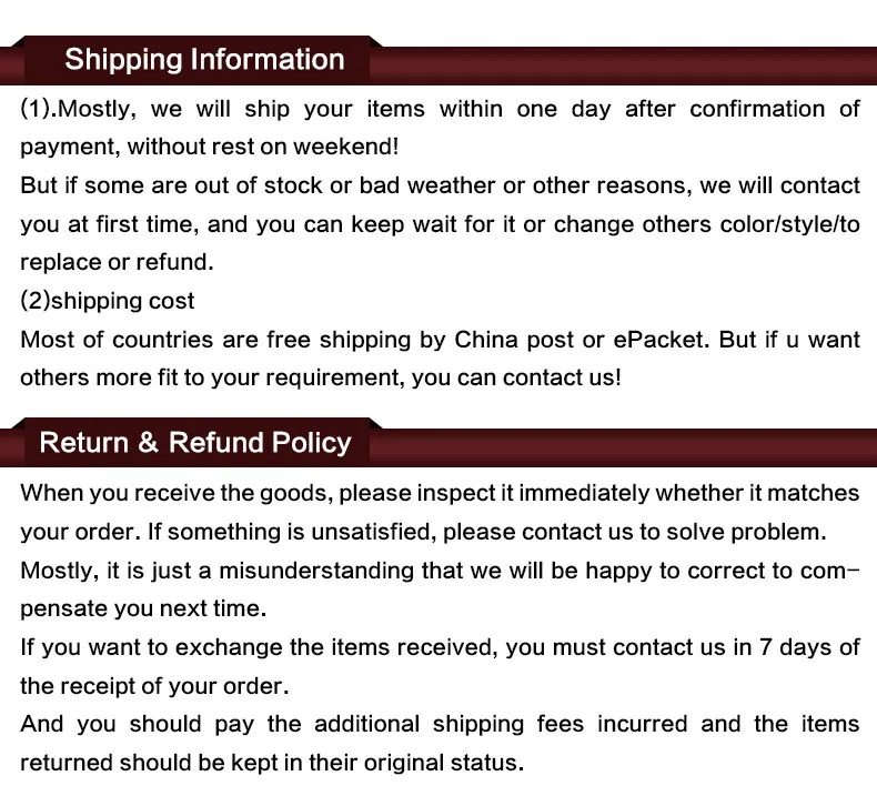 If the product you receive is not as described or low quality, the seller promises that you may return it before order completion (when you click "Confirm Order Received" or exceed confirmation timeframe) and receive a full refund. The return shipping fee will be paid by you. Or, you can choose to keep the product and agree the refund amount directly with the seller.N.B.: If the seller provides the "Longer Protection" service on this product, you may ask for refund up to 15 days after order completion.