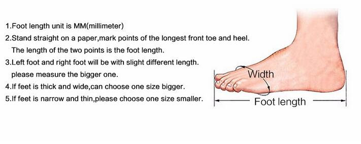 HEY!!! My friend Welcome to my shop, each order we will give 1 pairs of socks as a gift We have our own factory and the shoes deliveried directly from factory, we can ensure the best quality and the lowest price!! Note 1 : Please choose the size according to your foot length. Note 2 :We sent the shoes according to Eur size , If you find there are 3 countries shoes size, just use Europe size chart to verify the shoes you received, other countries size can be ignored Note 3 :Stand straight on a paper, mark points of the longest front toe and heel, the length of the two points is the foot length. Note 4 :The length of the left foot and right foot may be slightly different , please measure the bigger one. Note 5 : If your feet are think and wide, we suggest you choose one size bigger. if they are narrow and thin, we suggest you choose one size smaller. Note 6 : Please choose size according to foot length, (Dont choose size according to your country usual size !!!) "EUR" Size is only forreference, only trust the foot length! Note 7 : US size 7 (25cm). This 25CM is not insole length or outsole length, it means foot length only. Note8 . To avoid high custom tax, All of shoes will be shipped without "shoe box"; If you want the box, please leave us message;